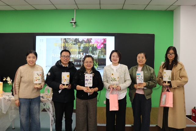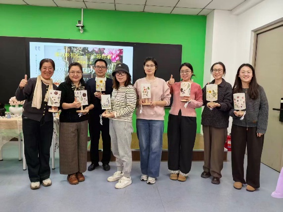 随后,手工老师详细讲解压花台灯制作流程、素材搭配及安全要点,从干花筛选到组件组装逐一演示,耐心解答疑问,老师们听得专注,纷纷记录关键步骤。实操环节,老师们精心构思、巧手创作:或以莲花诠释“出淤泥而不染”的廉洁内涵,或以松竹寓意刚正品格。大家相互交流技巧,现场充满温暖活力,忙碌的疲惫在创作中悄然消散。当一盏盏融入巧思的台灯点亮,柔和光芒透过干花散发独特韵味,老师们脸上满是成就感。