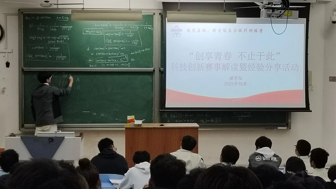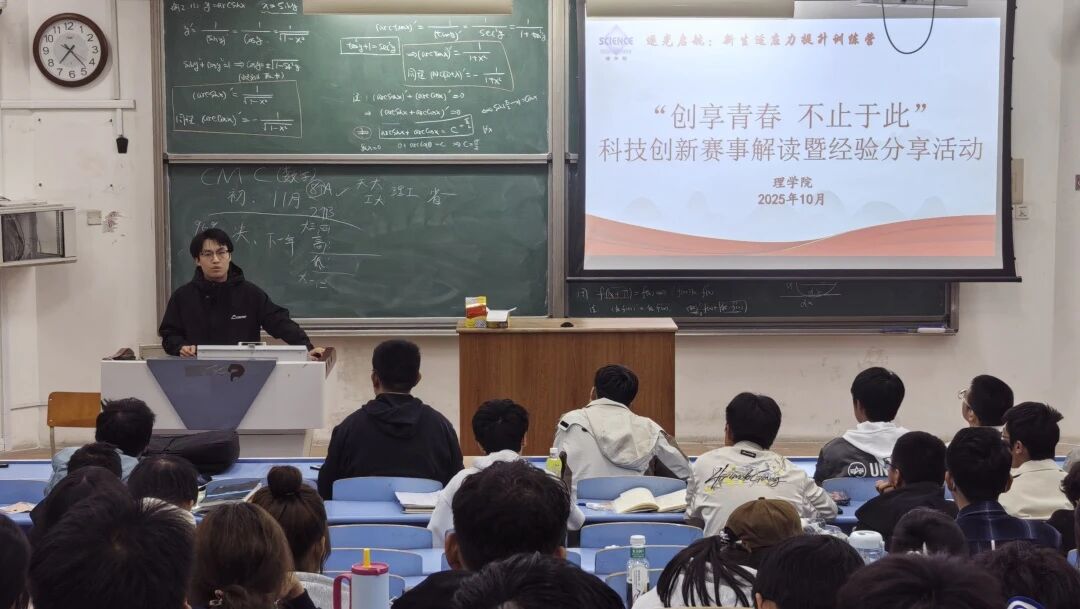 为帮助2025级学生熟悉学科竞赛基本知识,激发创新思维,理学院开展“创享青春 不止于此”科技创新赛事解读暨经验分享活动,本次活动由22级应用物理学专业马富祥、22级数学与应用数学专业徐杨智和23级数学与应用数学专业赵嘉璇担任主讲,全体25级新生参加。